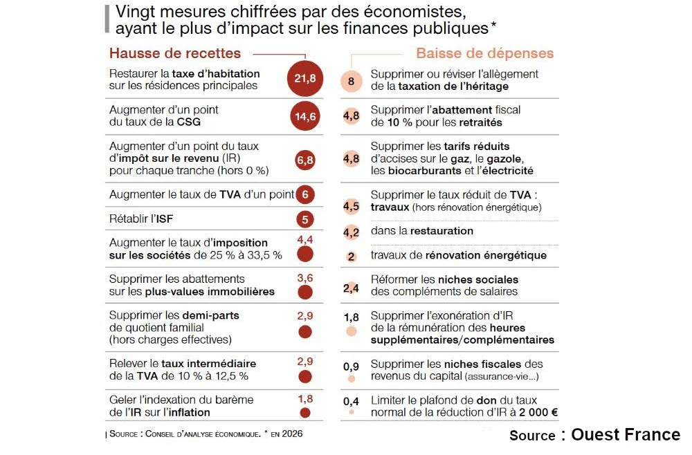 Avant d’aller plus loin dans l’analyse , il ne s’agit pas évidemment dans leurs recommandations de supprimer le CAE ni aucune des agences inutiles qui fleurissent dans notre beau pays , ni bien sur de s’attaquer à l’immigration ou l’AME, ni de proposer des réformes structurelles comme celle que j’ai proposé pour le système de santé en établissant un payeur unique. Il s’agit surtout d’augmenter les recettes ( c’est-à-dire en augmentant la pression fiscale ) de 111,4 milliards dès 2026 sur un total de « recettes » de 1250,9 milliards , avec en face de pauvres économies de 30,9 milliards (108 milliards à l’horizon 2030). Une partie des recettes sont en fait des nouveaux prélèvements déguisés par diminution de prestations ou subventions, y inclus une baisse substantielle de la contribution de l’État à l’enseignement privé ( ce qui représenterait 12% du total des économies proposées…).