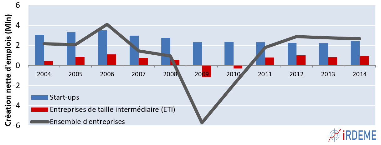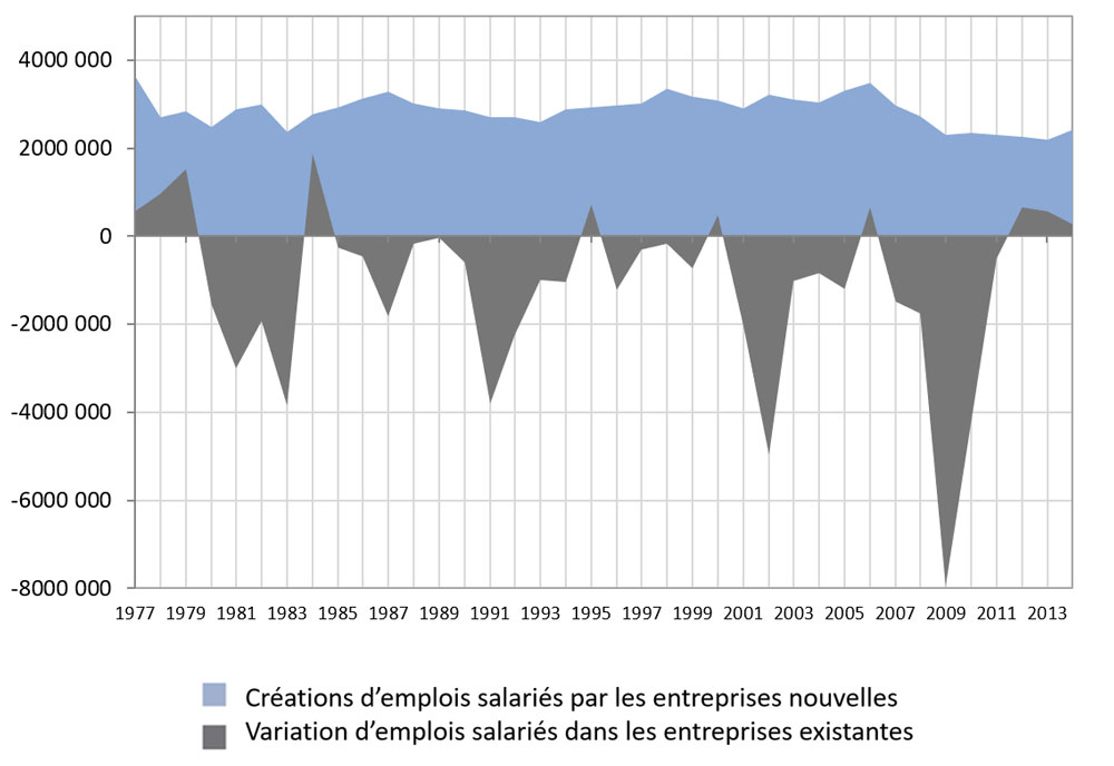 Dans une économie développée, même quand elle fonctionne bien, les entreprises déjà établies ne sont en général pas créatrices nettes d’emplois sur le long terme, quelle que soit leur taille. Elles assurent plutôt le renouvellement et le remplacement des emplois existants par suppression des emplois dont elles n’ont plus besoin.