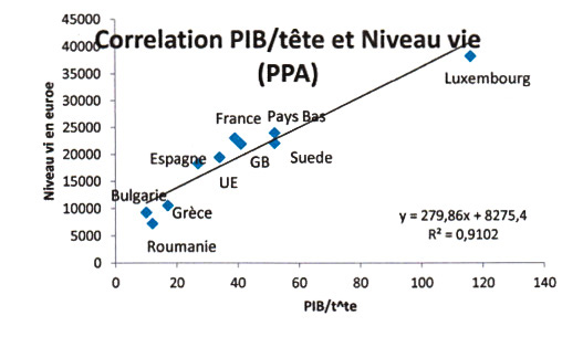 Selon l’équation de la droite de corrélation figurant sur le graphique plus haut l’économie française fournit aux habitants un niveau de vie de 19.602 euros par personne, soit, au niveau national, la somme de 1.332,9 Mds euros, pour 68 millions d’habitants. Or, le niveau de vie indiqué par l’INSEE représente, globalement, une richesse supposée de 1.567,8 Mds euros, soit un excédent de 234,9 milliards par rapport à ce que l’économie du pays peut fournir. On ne peut qu’incriminer, pour expliquer l’origine de ce surplus providentiel, l’excédent de dépenses publiques de l’Etat qui s’élève à 197,5 milliards d’euros, selon la comparaison faite plus haut avec les autres pays européens. Certes, les chiffres ne coïncident pas parfaitement, mais par l’approche que nous avons adoptée il ne peut s’agir que de simples ordres de grandeur.