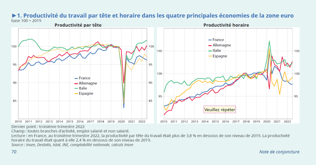 Dans un article précédent, nous avions attiré votre attention sur l’évolution négative de la productivité en France ce qui est un cas de figure plutôt inattendu. Les explications pertinentes de ce phénomène manquent cruellement : l’INSEE signale tout de même quelques pistes : le changement de classement des apprentis qui n’étaient pas intégrés au calcul et peu nombreux et qui le sont désormais pour presque 1 million de personnes lesquelles sont venues augmenter le dénominateur du ratio PIB/population active et donc ont fait arithmétiquement baisser la productivité au moins apparente. Pour être tout à fait corrects, ils ont, cela est vrai en général, une productivité inférieure à celle du personnel professionnel en place. Une deuxième raison serait la conservation du personnel pendant la crise COVID, par des entreprises soucieuses de l’avenir, alors que leur production était minorée par la crise.