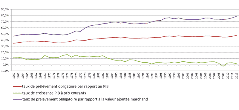 Il existe une corrélation très nette entre le taux de prélèvements obligatoires (impôts, taxes, cotisations et contributions sociales) et le taux de croissance comme le montre le graphique suivant :