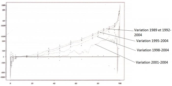 Changement de patrimoine d’une année à 2004 en fonction du percentile