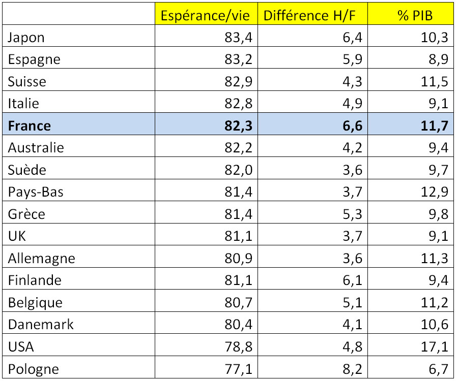 Il faut rappeler que les deux pays où l’espérance de vie est la plus élevée (Japon et Espagne) ont un coût, en % du PIB, nettement inférieur à celui de la France (10,3% et 8,9 % respectivement contre 11,7% en France), alors que le pays qui dépense le plus (USA, 17,1% du PIB) est l’avant-dernier de la liste ….
