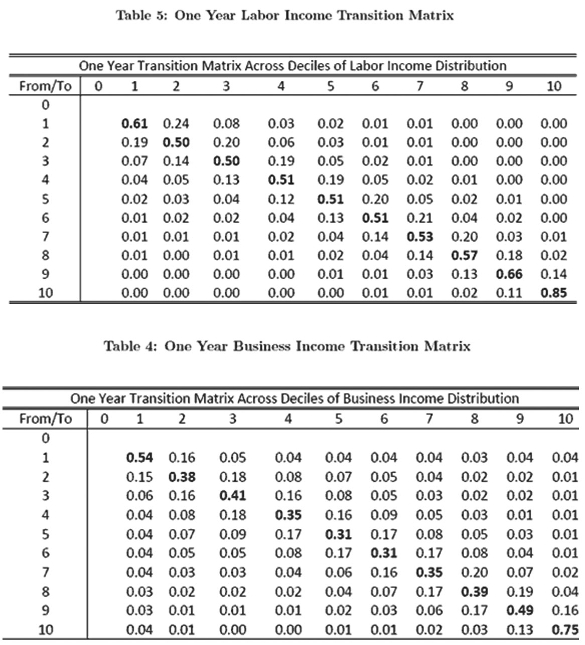 Les revenus sont classés en 10 groupes. On y voit que si l‘on est salarié (première matrice) et qu’on figure dans le décile de revenus les plus bas, on a 61 chances sur 100 d’y rester, mais qu’il n’y a qu’une chance sur 100 d’aller au 7ème décile et moins de 1% d’aller au-dessus, alors qu’un entrepreneur (seconde matrice) a encore 4 chances sur 100 de parvenir en 1 an au niveau de revenu le plus élevé.