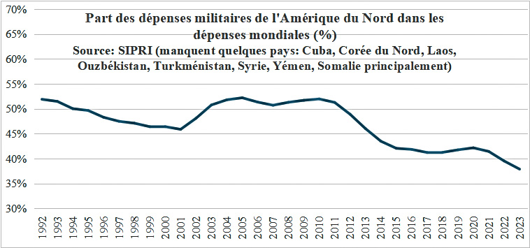 La forte baisse de la part de l’Amérique du Nord -pour l’essentiel, les États-Unis- dans les dépenses militaires mondiales n’est pas seulement la conséquence du poids démographique et économique déclinant des États-Unis, en termes relatifs. Elle résulte aussi de la diminution du taux d’effort militaire de ce pays (5,6 % du PIB en 1990, 3,5 % en 2022, selon la Banque mondiale), plus forte que celle constatée dans le monde entier (3,3 % du PIB en 1990, 2,3 % en 2022).
