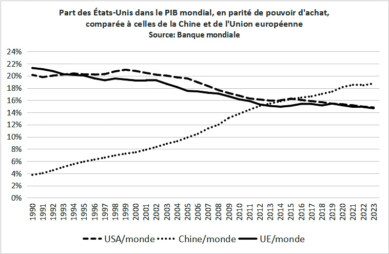 Contrairement à certaines idées reçues, la comparaison des courbes des États-Unis et de l’Union européenne ne fait pas apparaître de différence marquée entre ces deux économies. Depuis le début des années 2000, la part des États-Unis dans le PIB mondial a plutôt décliné plus vite que celle de l’UE.