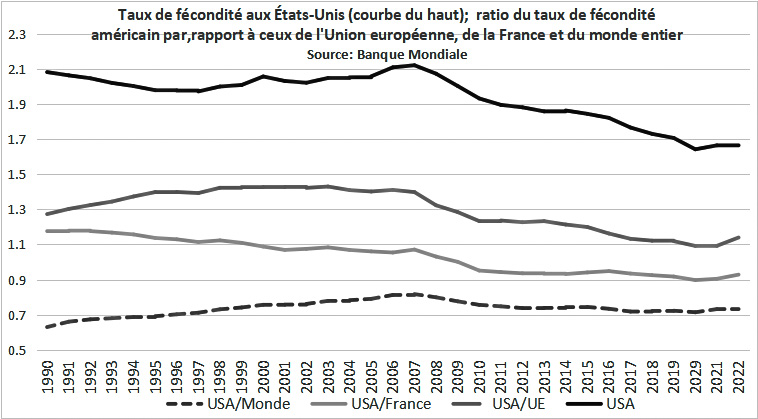 Jusqu’à 2008, la fécondité américaine s’était maintenue à un niveau largement supérieur -de l’ordre de 30 %/40 %- à celle de l’Union européenne. Cet écart a fortement baissé ensuite pour se stabiliser autour de 10 %. Par rapport à la France, la détérioration de la situation relative des États-Unis est encore plus spectaculaire. En 1990, le taux de fécondité américain était supérieur de près de 20 % au taux français ; en 2022, c’est l’inverse : ce taux est devenu inférieur de 10 % à celui de la France.