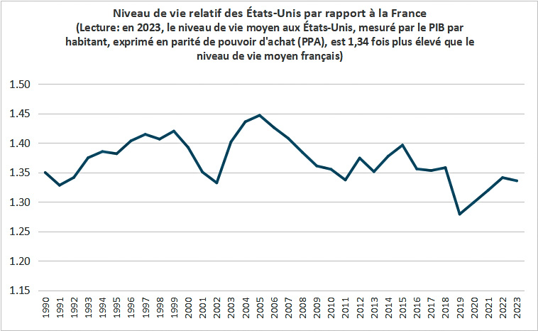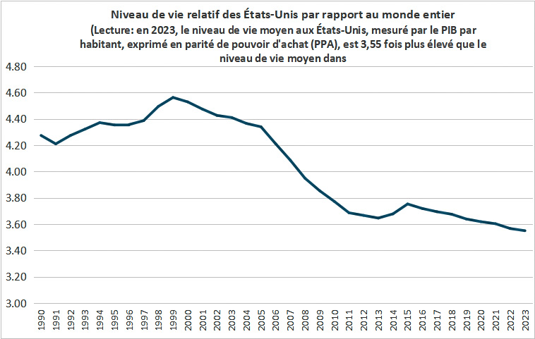 Des évolutions comparables se constatent en ce qui concerne le niveau de vie (PIB par habitant en PPA). Les États-Unis se font rattraper par le monde entier : jadis plus de quatre fois plus riche que l’être humain moyen, l’Américain ne l’est que 3,5 fois aujourd’hui. La comparaison avec la France met à mal une autre idée reçue. Sur l’ensemble de la période considérée (1990-2023), les fluctuations observées n’ont entraîné aucune variation de la position relative des deux pays entre les deux dates extrêmes. Le niveau de vie moyen du Français ne s’est pas détérioré par rapport à celui de l’Américain moyen.