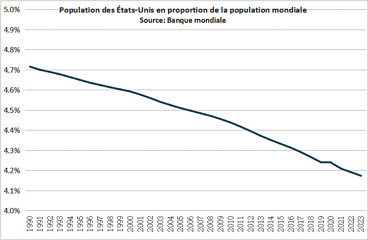 La population américaine décline régulièrement en termes relatifs, et ce, bien qu’elle ait augmenté en chiffres absolus et qu’elle ait été alimentée par une immigration substantielle pendant toute la période ici considérée.