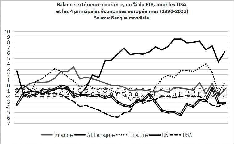 Le graphique ci-dessous compare l’évolution de la balance extérieure courante aux États-Unis et dans les 4 plus grandes économies européennes. Les États-Unis sont seuls, avec le Royaume-Uni, à avoir eu une balance déficitaire tout au long des 33 années considérées. En 2023, sur les 19 économies les plus importantes du monde, ils étaient à l’avant-dernier rang, juste avant la Turquie, des pays classés en fonction du solde de leur balance courante, exprimé en proportion du PIB.