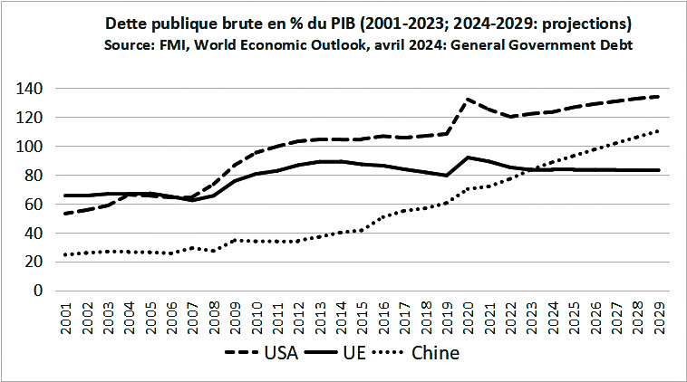 Les statistiques comparatives du FMI pour la dette publique totale n’incluent les États-Unis que depuis 2001. Pendant plus de vingt ans, ce pays a laissé filer la hausse de son endettement public. Celui-ci est passé de 53 % du PIB en 2001 à 122 % en 2023, et cela ne semble pas près de s’arrêter. Selon les projections du FMI, le besoin d’emprunt public annuel devrait représenter 6 à 7,1 du PIB selon les années pour 2024-2029. Le taux d’endettement public devrait encore s’accroître à un rythme soutenu, pour atteindre près de 134 % du PIB en 2029. Comparée aux États-Unis, l’Union européenne apparaît, sur ce point, comme la fourmi face à la cigale de la fable. Même en France, où la dérive des finances publiques donne lieu à des alertes répétées, le taux d’endettement public ne s’est accru « que » de 52 points entre 2001 et 2023, contre + 69 points aux États-Unis.