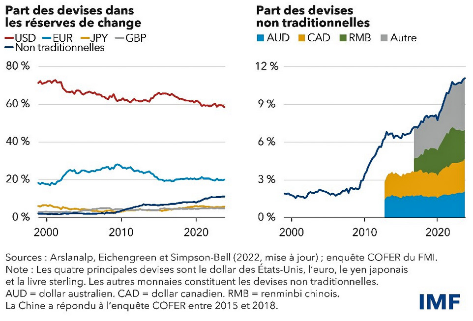 Le dollar restera-t-il encore longtemps la monnaie mondiale dominante ? Au vu de la tendance actuelle, sa part dans les réserves de change mondiales, supérieure à 70 % en 2000, devrait passer en dessous de 50 % vers 2040-2045 : cf. graphique ci-dessous du FMI (situation actualisée à fin 2023), tiré de S. Arslanalp, B. Eichengreen, C. Simpson-Bell, « Prédominance du dollar dans le système des réserves internationales. Mise à jour », IMF Blog, 12 juin 2024, en ligne.