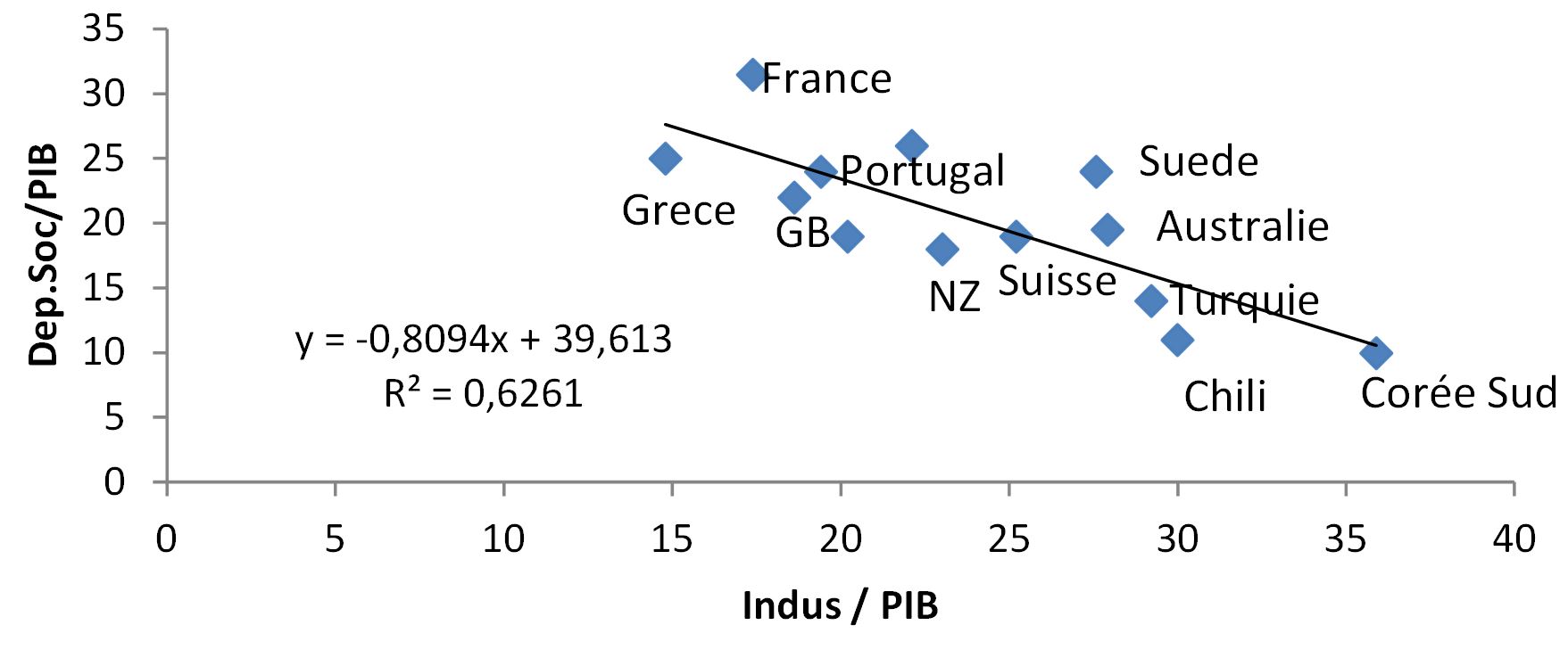 Corrélation Dépenses sociales/PIB et Production industrielle/PIB