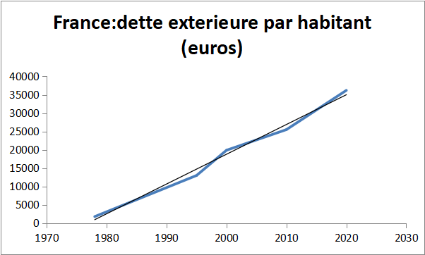 Le financement de tous ces acquis sociaux a nécessité un recours constant à l’endettement, l’économie française ne produisant pas suffisamment de richesse. L’endettement du pays ne cesse donc pas d’augmenter, et la courbe suivante montre ce qu’il en est de l’endettement quand on le calcule par habitant :