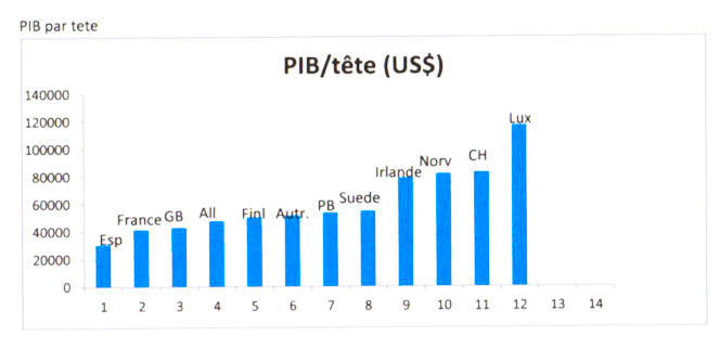 La France a un taux de population active particulièrement faible, ce qui signifie qu’il y a un nombre anormalement élevé de personnes qui ne travaillent pas, vivant donc à la charge de la collectivité nationale. On voit, également, que la durée de la vie active est bien plus courte que dans les autres pays : les gens entrent dans la vie active trop tard et partent à la retraite trop tôt. Autre acquis, la durée légale de travail hebdomadaire est inférieure à celle des autres pays, et le nombre d’heures travaillées par an est bien plus faible que chez nos voisins. Il en résulte, inévitablement, un PIB per capita inférieur à celui des pays nordiques, ou de la Suisse, comme le montre le graphique ce dessous :