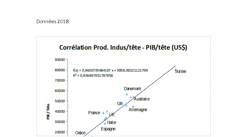 La Suisse, avec une production industrielle importante /personne obtient un PIB/capita particulièrement élevé. La France qui s’est très fortement désindustrialisée et très loin derrière.