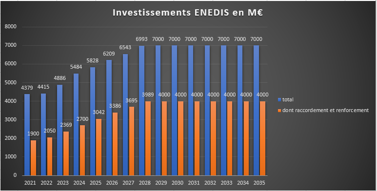 On constate pour ENEDIS, que le montant des investissements annuels, historiquement de 4 à 5 Md€ par an, va croître, puis se stabiliser à partir de la fin de la période du TURPE 7 à un niveau de l’ordre de 7 Md€ par an, dont une progression de 2 à 4 Md€ pour le raccordement et les renforcements (on peut évaluer sur ce dernier montant la part du raccordement des ENR à 1,5 – 2 Md€).