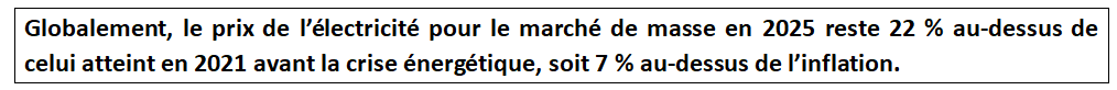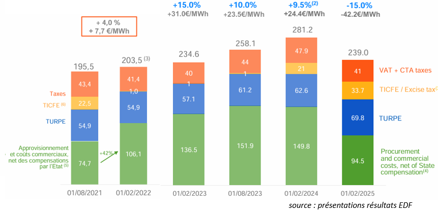 Sous l’effet de la crise provoquée par l’envolée du prix du gaz, et aggravée en France par la baisse de 25 % de la production nucléaire due au défaut générique de corrosion sous contrainte et une hydraulicité faible, la composante coût de fourniture et commercialisation (en vert) a fortement progressé, avec un effet retard dû à la mise en place très coûteuse en 2022 et 2023 d’un bouclier tarifaire par le gouvernement (environ 30 Md€) et de la quasi annulation de la TICFE, regroupée ensuite avec les taxes locales dans la taxe accise, le niveau de taxe (hors TVA) en février 2025 retrouvant au total celui de 2021.