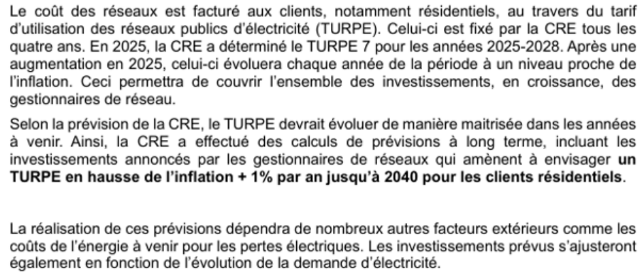 Le coût d’utilisation des réseaux (TURPE) dans la facture des particuliers et TPE a évolué de 50,2 €/MWh TTC en 2010 à 83,8 €/MWh TTC en 2025, soit une augmentation de 67 % en euros courants, et 32 % en plus de l’inflation. Or cette augmentation résulte en partie des investissements réalisés pour accueillir sur le réseau les ENR, à côté du système Linky et des bornes de recharge VE pour le réseau de distribution.