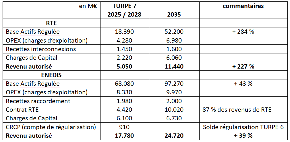 Après la période du TURPE 7 (2025-2028), déjà marquée par une augmentation sensible des investissements de RTE et d’ENEDIS, l’évolution future du TURPE devra prendre en compte la forte augmentation des investissements prévue par RTE et ENEDIS dans le cadre du projet de Programmation Pluriannuelle de l’Énergie 2025-2035 (PPE 3) et de la Stratégie Nationale Bas Carbone (SNBC), avec l’accélération, actuellement prévue, des renouvelables, qui se traduira par une augmentation sensible des charges de capital, mais aussi des OPEX de maintenance des réseaux.