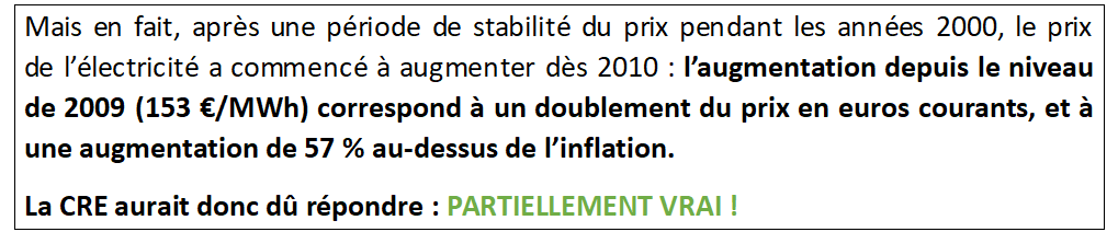 En se basant sur le tarif réglementé de vente d’électricité (TRVE), qui effectivement sert de repère sur le marché de masse (particuliers et TPE), avec un calcul respectant le principe de « contestabilité » qui permet à tout fournisseur d’être plus compétitif que le TRVE, la CRE indique que, depuis 2015, le prix TTC a augmenté de 45 %, soit 20 % au-dessus de l’inflation en euros constants.