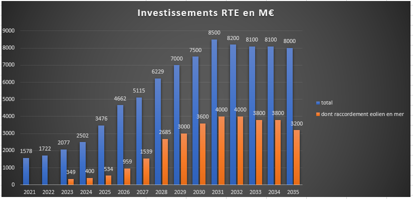 Ces prévisions d’investissement (la CRE cite dans son document 100 Md€ pour le gestionnaire du réseau de transport d’électricité (RTE) et 90 Md€ pour le principal gestionnaire des réseaux de distribution (ENEDIS) d’ici 2040) sont explicitées dans les diagrammes ci-dessous à horizon 2035, en fonction des éléments disponibles, notamment le schéma de développement du réseau de RTE3 et la délibération de la CRE pour le TURPE HTA-BT pour ENEDIS4