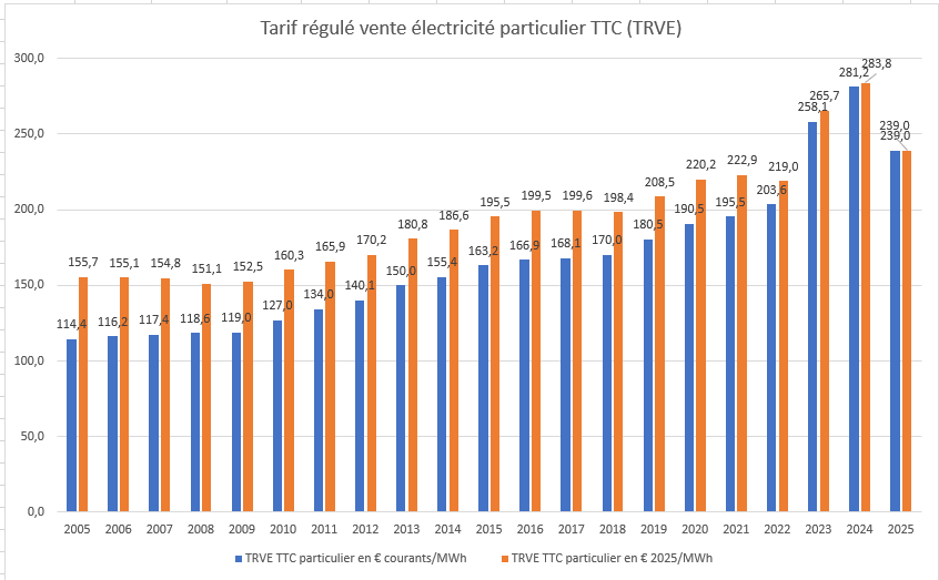 La figure ci-dessous, établie à partir des délibérations de la CRE et de la publication des résultats annuels d’EDF, reconstitue le montant du TRVE depuis 2005, en euros courants et en euros 2025 :