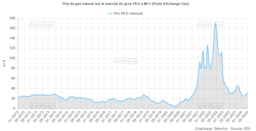 Sur la période récente, dans ses publications mensuelles sur le prix repère du gaz naturel1, faisant suite à la fin du tarif réglementé fin juin 2023, la CRE (Commission de Régulation de l’Energie) a retenu comme coût d’approvisionnement du MWh 49 € en décembre 2023, 45,6 € en janvier 2024, 28 € en juin 2024, et 32,2 € pour juillet 2024 : on voit donc la persistance d’une volatilité importante du coût d’approvisionnement, qui est de façon incontournable subie par les consommateurs français, même si elle n’atteint pas les sommets spéculatifs de l’année 2022.