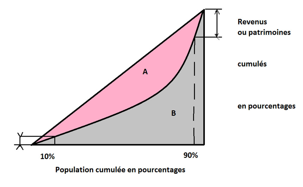 Cette mesure est généralement effectuée à partir de la courbe de distribution dite de Lorenz, qui consiste à répartir toute la population intéressée du plus pauvre au plus riche de gauche à droite sur la base du rectangle en noir et de totaliser en ordonnée leurs revenus (ou patrimoines) ; et un coefficient dit de Gini, du nom de l’économiste qui l’a inventé comme le rapport entre les surfaces A et A+B.
