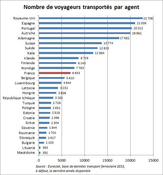 Il est surprenant de voir que, selon les données d’Eurostat, la France est très mauvaise en nombre de voyageurs transportés par agent. Cela a été constaté par d’autres études antérieures, basées notamment sur les données de l’Union internationale des chemins de fer pour le début des années 2000, mais rien n’a changé depuis plus de 10 ans.
