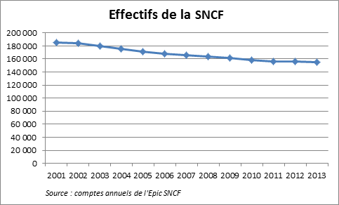 Comme le démontre parfaitement le graphique ci-dessus, les effectifs de la SNCF demeurent pratiquement stables ces dernières années, cela malgré les recommandations de la Cour des comptes. Une légère baisse de 16% a eu lieu entre 2001 et 2013, mais cela paraît insuffisant, notamment au regard de l’expérience des autres pays. La plupart des opérateurs ferroviaires en Europe, confrontés eux aussi à la concurrence forte d’autres moyens de transport, notamment du transport routier, ont réussi à baisser fortement leurs effectifs pour pouvoir maintenir leur rentabilité. Explications à suivre.