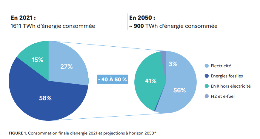La Stratégie proposée retient pour objectif une réduction de la consommation d’énergie finale à 1.209 TWh en 2030 et à 900 TWh en 2050, alors que cette consommation était en 2021 de 1.611 TWh (en légère diminution tendancielle depuis le niveau de 2012 de 1.661 TWh) :