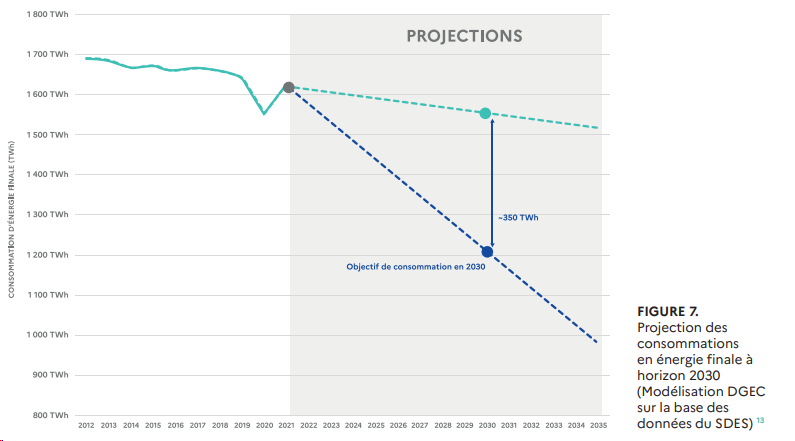 En effet, les efforts de sobriété, auxquels ont consenti les français en 2022, peuvent sans doute être consolidés dans la durée, mais ne sont pas cumulatifs. Ils constituent en quelque sorte un « fusil à 1 coup » : une fois que l’on a abaissé la température de chauffage à 18 ou 19 °C, on ne va pas la diminuer à 17 °C, puis de 1° C supplémentaire par an les années suivantes.