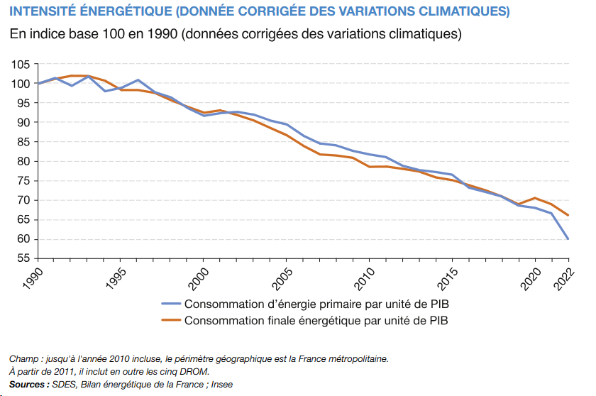 Les efforts d’amélioration de l’efficacité énergétique conduits depuis près de 30 ans dans tous les secteurs de l’économie (bâtiments, transports, industrie), en intégrant la diminution de 3,1 % de la consommation en 2022 (augmentation des prix, plan de sobriété), ont permis de découpler croissance économique et consommation d’énergie, avec une diminution moyenne annuelle de 1,5 % par an de l’intensité énergétique, la consommation finale d’énergie par unité de PIB diminuant à 66 pour une base 100 en 1994 :