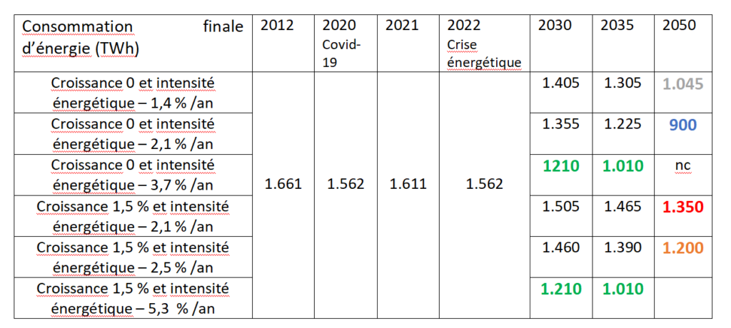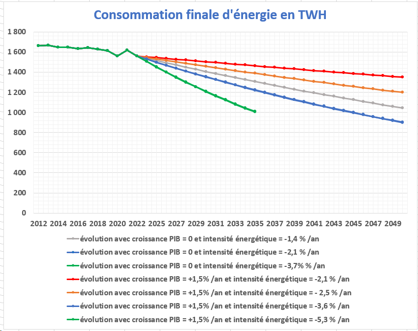 En prenant en compte une croissance du PIB de 1,5 % par an, la quantité d’énergie nécessaire, avec un pilotage des actions d’amélioration de l’efficacité énergétique et le maintien des efforts de sobriété et de lutte contre le gaspillage, peut être estimée dans une fourchette de 1.200 à 1.350 TWh, sous réserve d’une amélioration de l’efficacité énergétique de 2,1 à 2,5 % par an, soit + 50 % par rapport au rythme historique.