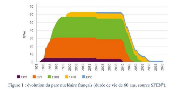 Sur la base d’une prolongation de la durée de vie de l’ensemble des réacteurs encore en fonctionnement du parc historique (après fermeture anticipée de Fessenheim en 2020), et de la mise en service de l’EPR de Flamanville, un « effet falaise » se produira dès 2040, et la capacité nucléaire résiduelle sera au maximum de 16 GW en 2050, et de 1,6 GW en 2060 (EPR Flamanville) :