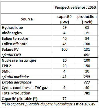 La capacité pilotable ne dépassera pas 72 GW, en pérennisant les 9 GW de cycles combinés à gaz et turbines à combustion existantes (TAC), ainsi que les centrales bioénergies existantes et les centrales à charbon de Cordemais et Saint-Avold converties à la biomasse, comme le montre le tableau ci-dessous :
