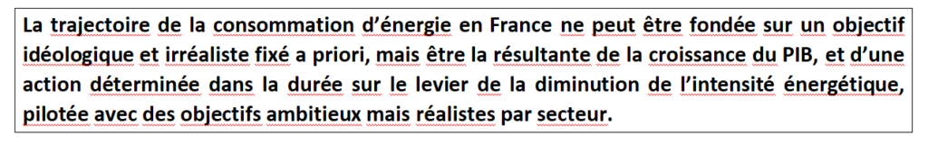 - Un objectif de réduction de la consommation d’énergie en rupture par rapport au passé, et incompatible avec une réindustrialisation de la France.