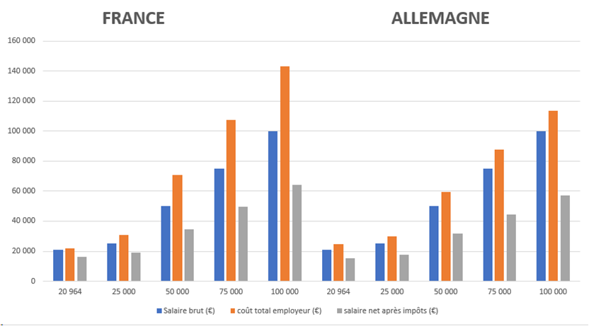 Pour un salaire brut correspondant au smic français, le coût employeur annuel est de 3.107 euros supérieur en Allemagne par rapport à la France ; pour un salaire brut de 100.000 euros, c’est l’inverse : le coût est inférieur (de 29.808 euros) en Allemagne. Dès la barre de 25.000 euros franchie en brut, l’employeur français paie plus que l’employeur allemand.